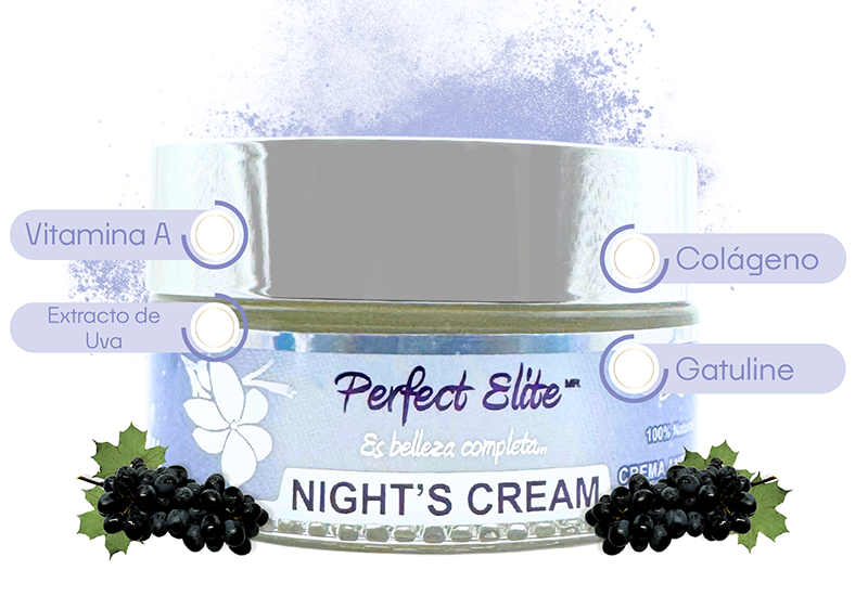 Extracto de Uva (Proporciona una hidratación profunda a la piel, manteniéndola suave, flexible y radiante) Gatuline (Reduce arrugas y líneas de expresión, además de mejorar el tono y la firmeza de la piel) Colágeno (Ayuda a la piel a mantenerse hidratada, protegida y elástica, además de prevenir el envejecimiento y la flacidez facial) Vitamina A (Nutriente que ayuda a eliminar células muertas para mantener la piel sana y equilibrada) Elastina, vitaminas A y E, jalea real, gatuline, fisión skin moisture, glucam E 20, extracto de uva, fresa. “Estos junto con otros ingredientes que mantienen la hidratación y salud de la piel”.